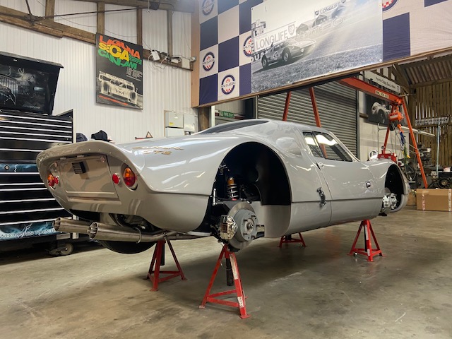 Once purchased we set about placing the chassis on a jig to ensure all suspension points etc were in the correct places. We had to make a few small repairs to the chassis to make it as it should be. Once the repairs had been made the fibreglass body was constructed and fixed around the chassis exactly as the cars were built in period. The body was then painted in its original colour of GT Silver metallic.