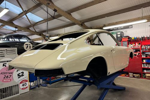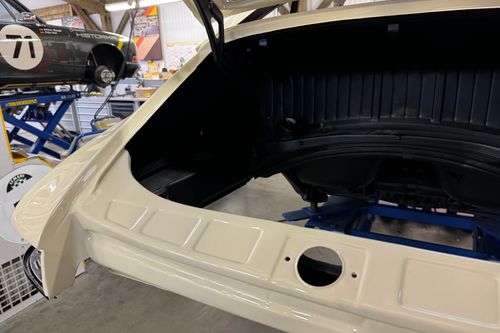 We have completed the metal work restoration to our usual exacting standards with all 65 details in place. We have had a custom built "bolt in" FIA roll cage manufactured and shell is now painted in it's original colour of light ivory. Next we will commence the build to one of our full FIA appendix K and front running 2.0L cup race cars.