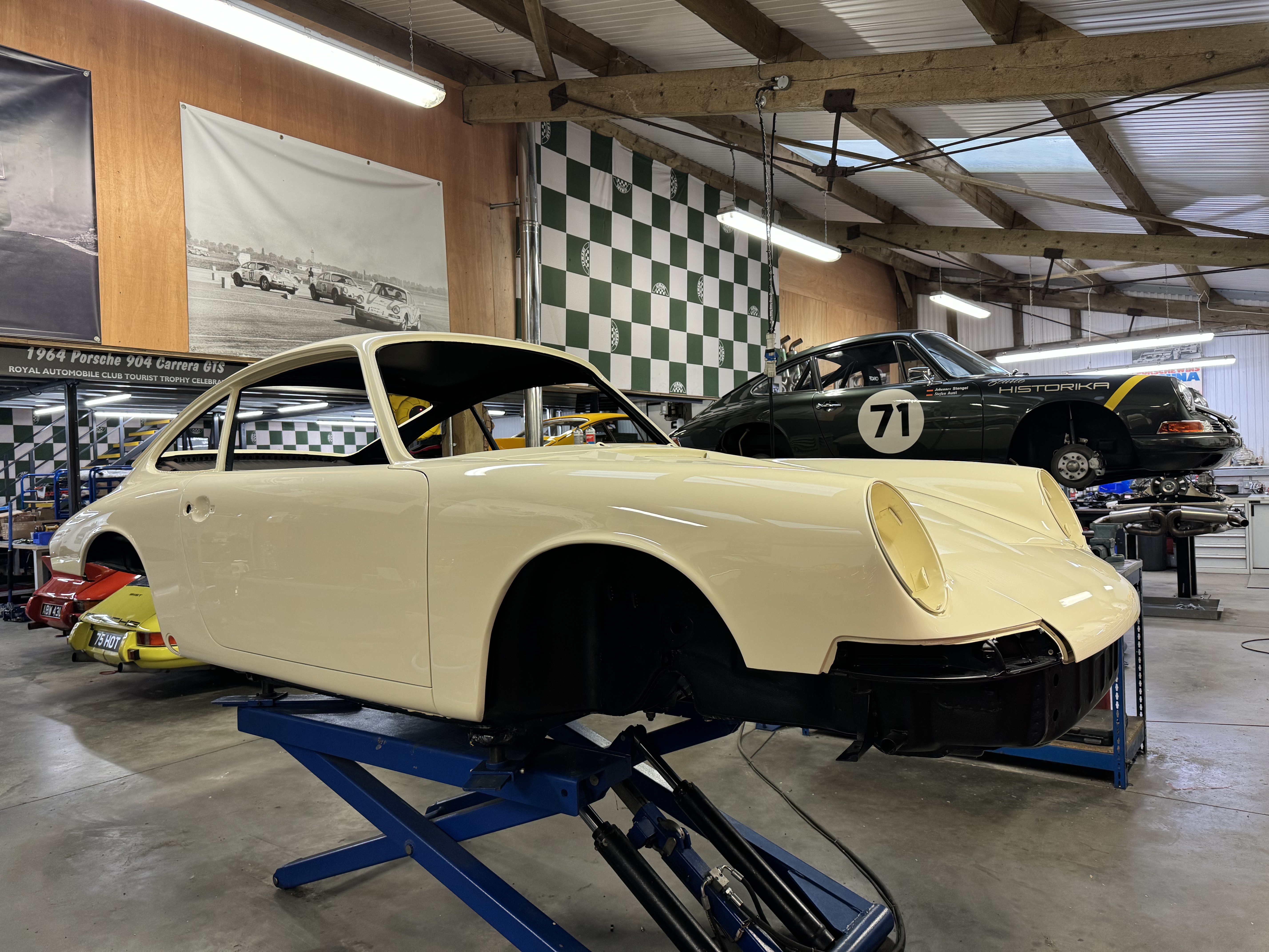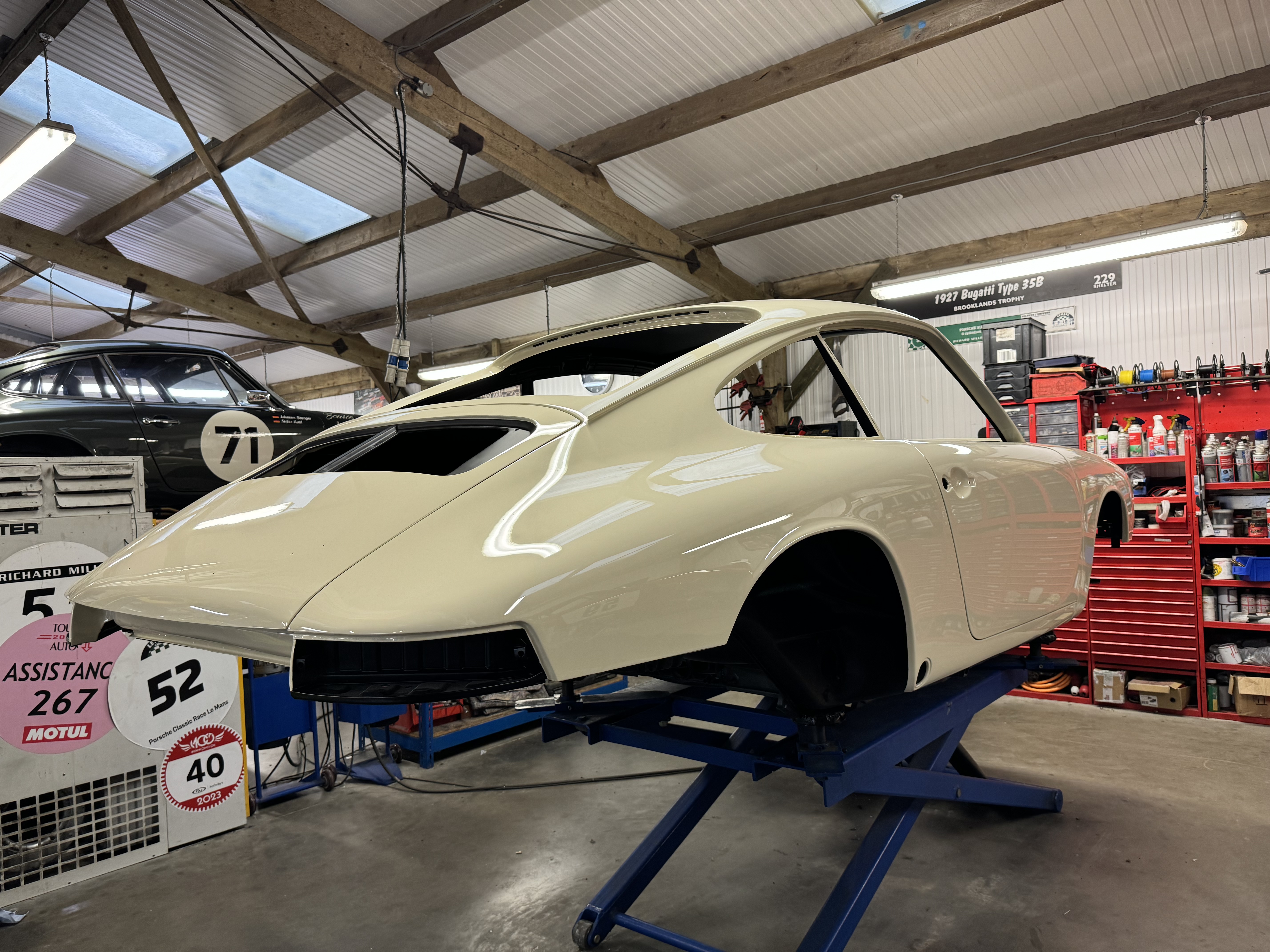 We have completed the metal work restoration to our usual exacting standards with all 65 details in place. We have had a custom built "bolt in" FIA roll cage manufactured and shell is now painted in it's original colour of light ivory. Next we will commence the build to one of our full FIA appendix K and front running 2.0L cup race cars.